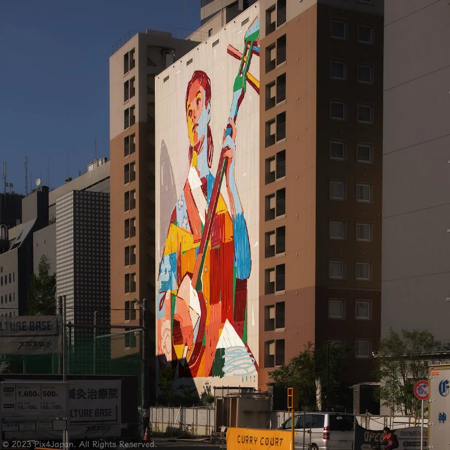 Taking inspiration from Harunobu Suzuki's traditional ukiyo-e depicting two women playing the shamisen by a river, Octavi Arrizabalaga (also known as Aryz) carefully selected the ideal location for his artwork. Situated amidst canals on all four sides, this setting perfectly complemented the painting's exquisite beauty, especially when viewed from a small boat gliding along the canal.