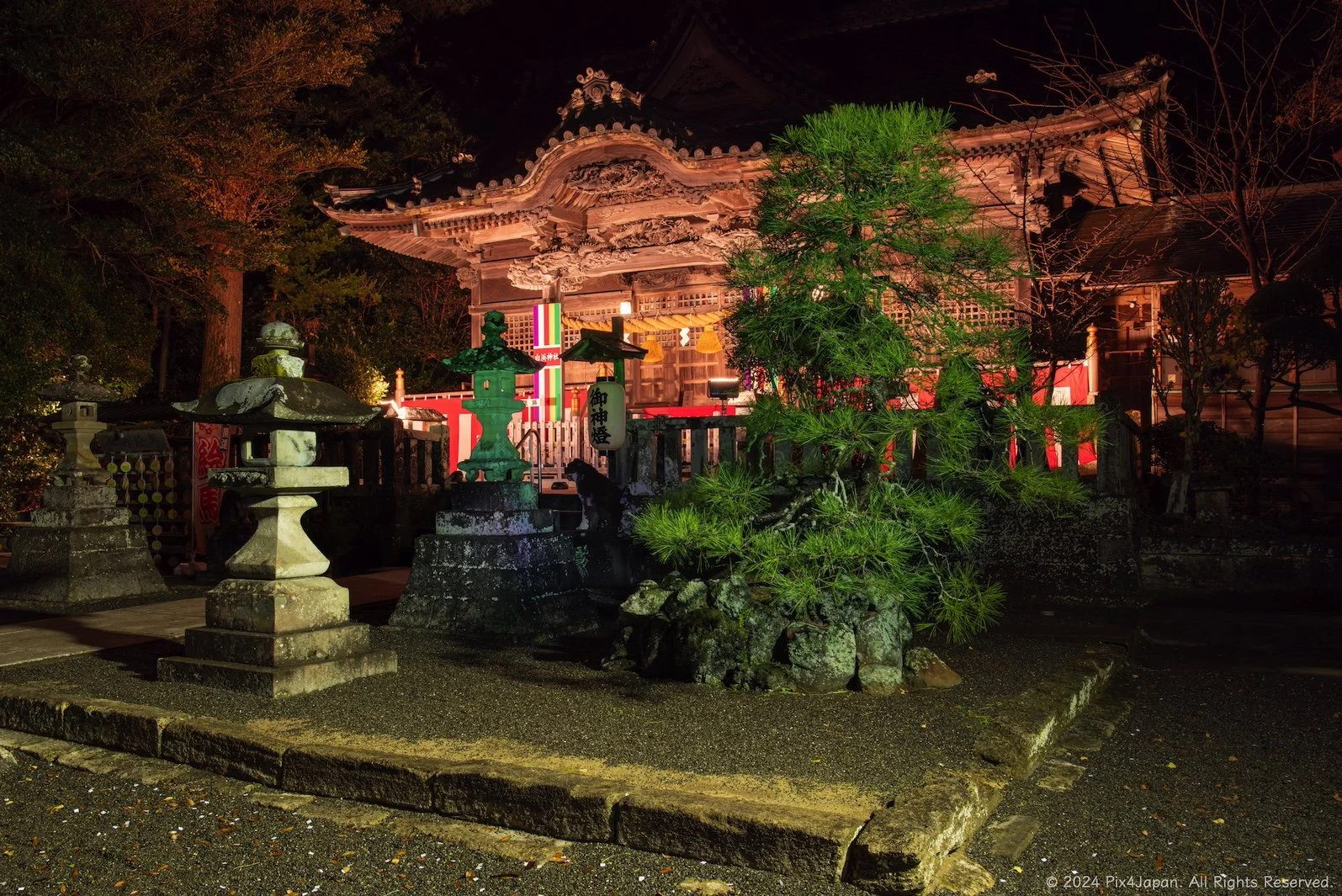 In the photo, you've got your usual Shinto shrine courtyard with a neatly trimmed pine tree, some stone fencing, hanging paper lanterns, and my personal favorite, moss-covered stone lanterns.