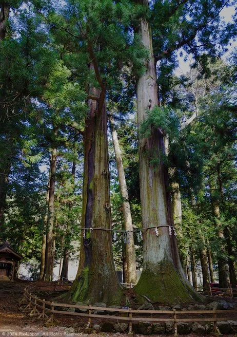 The cedar on the right is named after Izanagi-no-Mikoto, a male deity from Japanese mythology who, according to legend, fathered Japan, the sun, the moon, and storm gods. On the left stands a cedar named after Izanami-no-Mikoto, a female deity known for giving birth to numerous gods and being the wife of Izanagi-no-Mikoto.